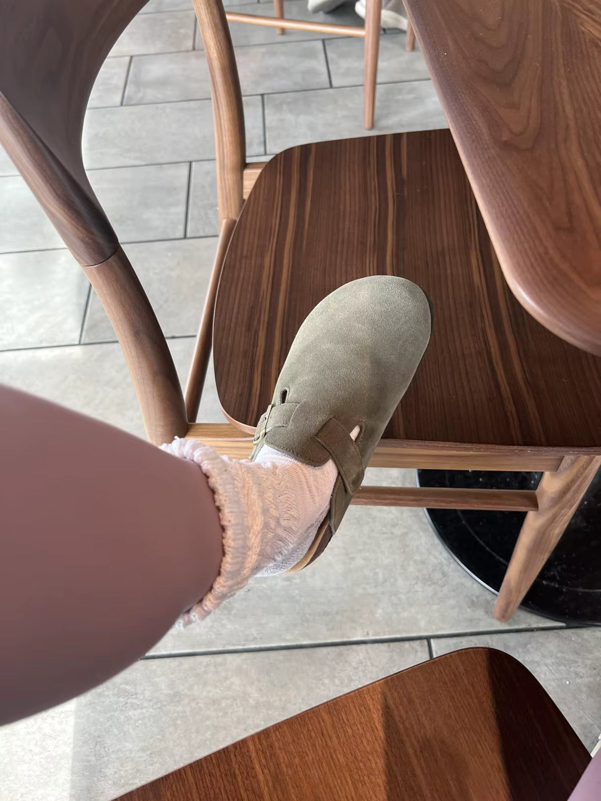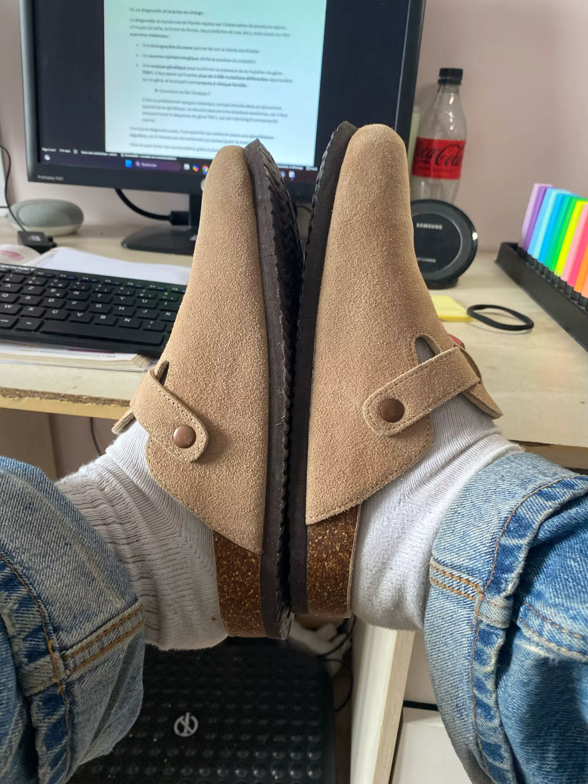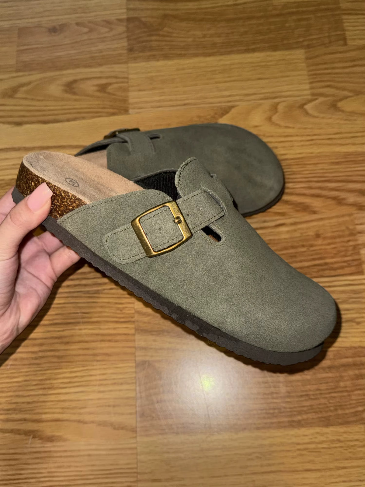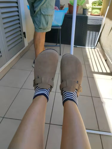 Answer 1: These clogs are crafted from premium cow suede for a soft and stylish exterior, combined with a molded cork footbed that adapts to your foot shape, providing customized support and alleviating discomfort. This combination ensures both luxury and practicality, making them perfect for all-day wear.